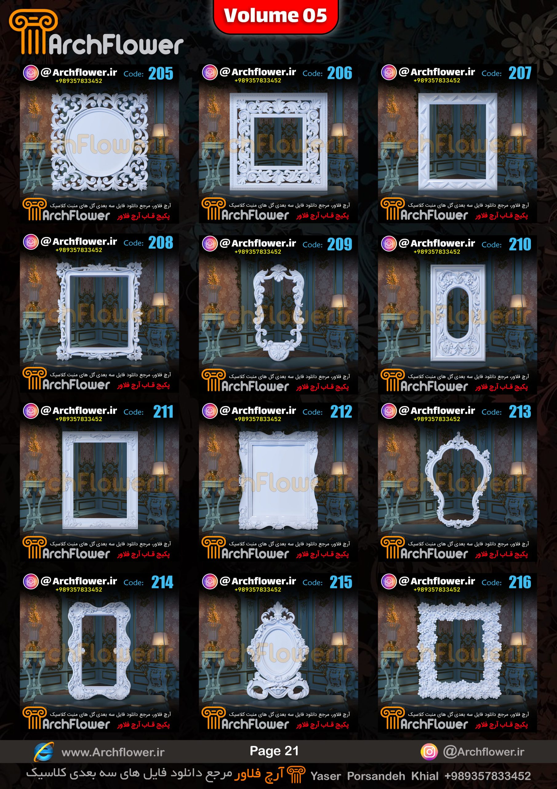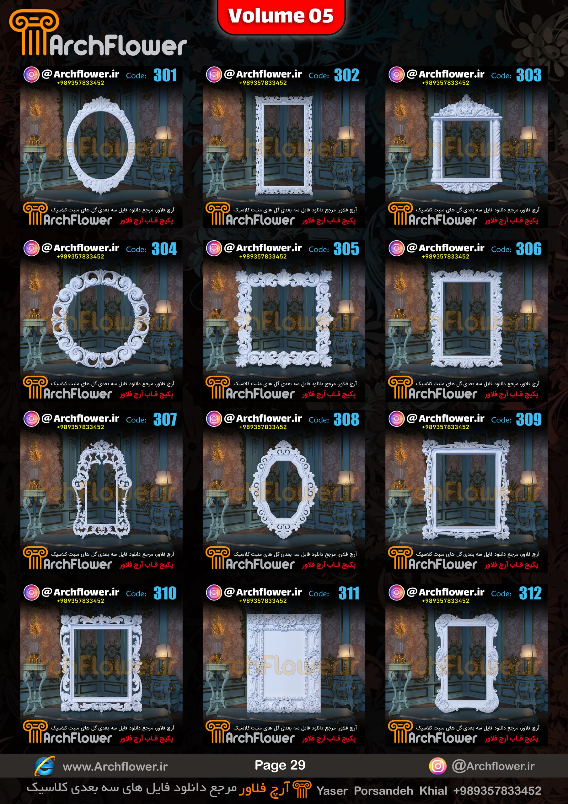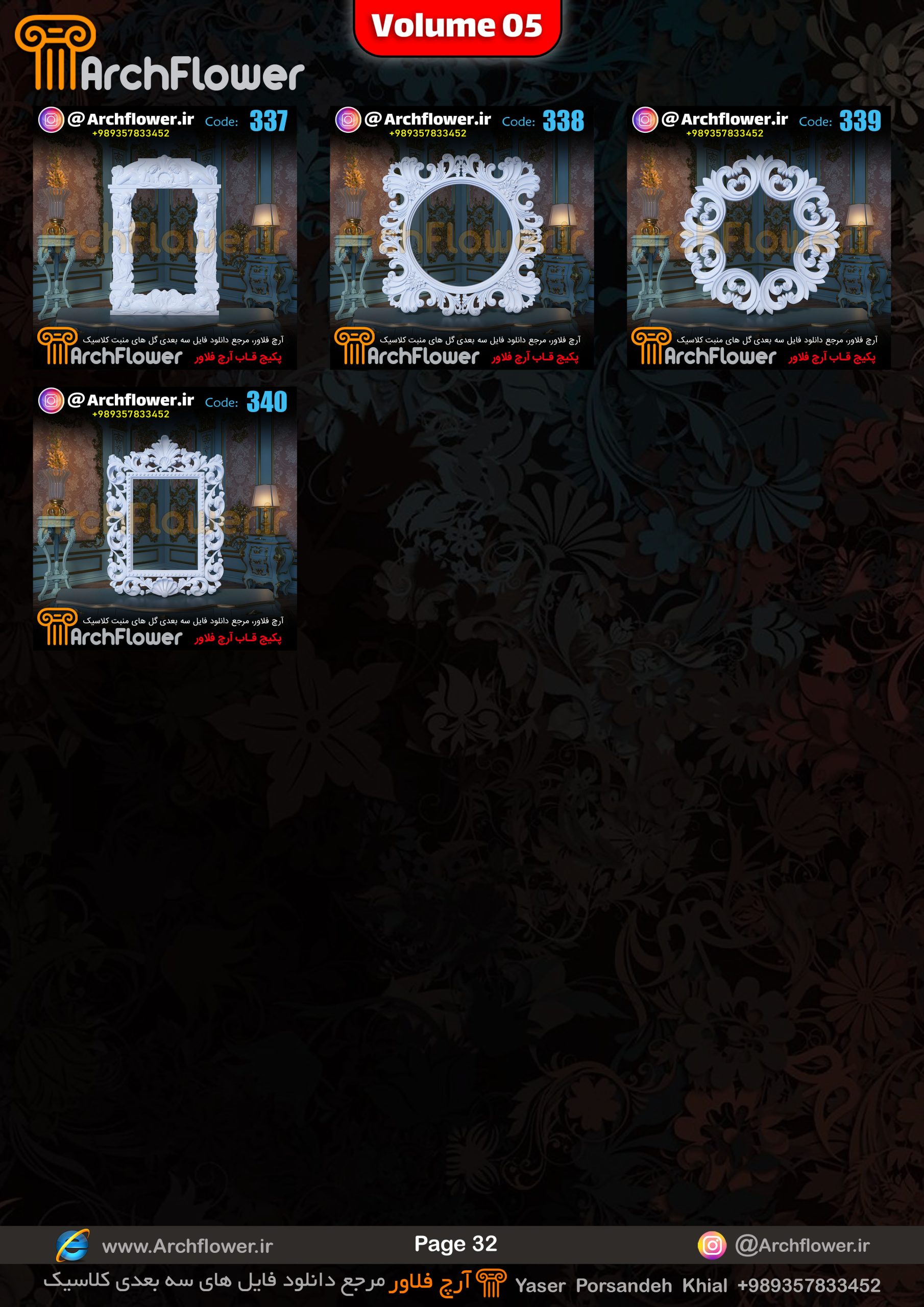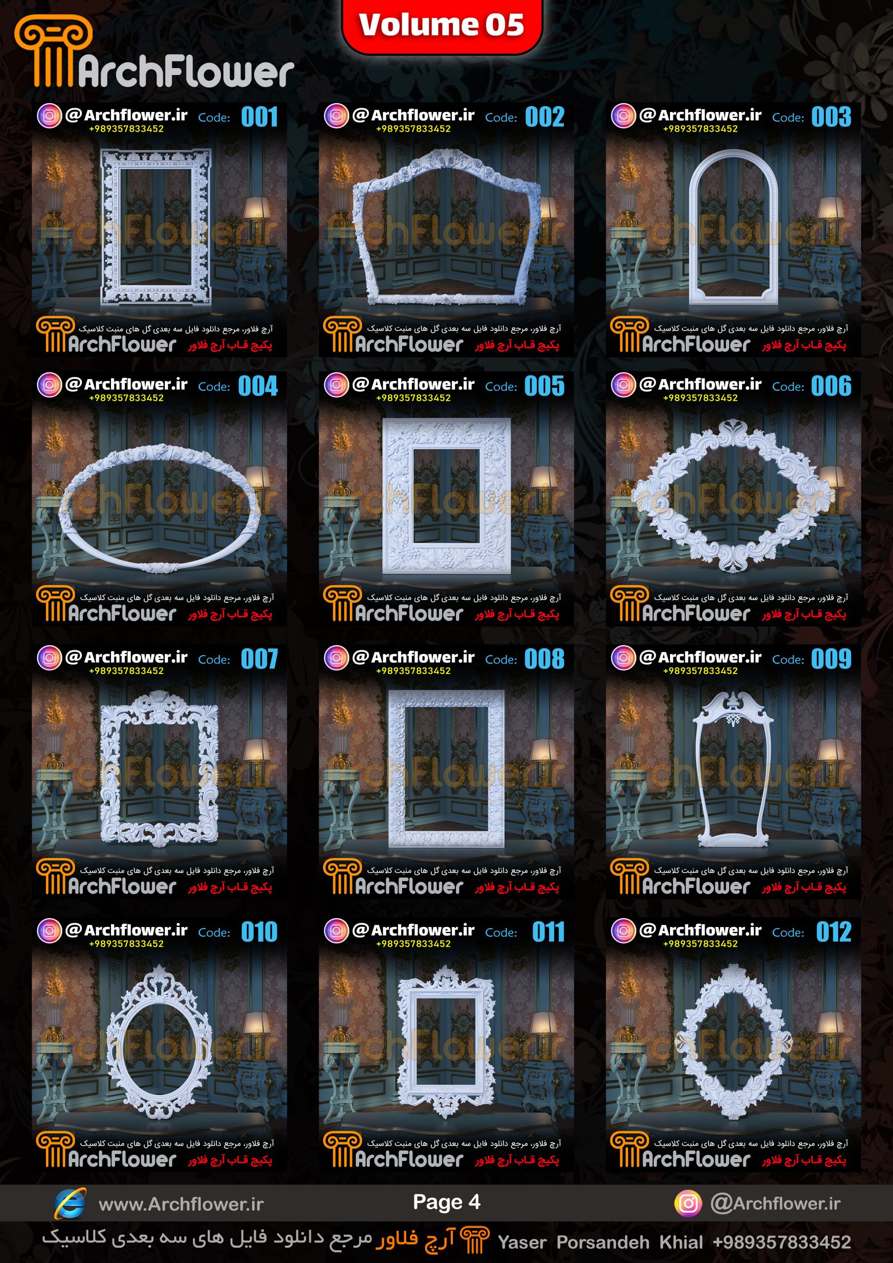 این مجموعه (قاب های کلاسیک) شامل پکیج فایل سه بعدی گل های منبت با عنوان ( فایل های سه بعدی انواع قاب های کلاسیک : Archflower_Vol.05) میباشد.علاقمندان به طراحی پروژه های کلاسیک میتونن آبجکت های این مجموعه رو تهیه کنند.و در پروژه های کلاسیک خودشون استفاده کنن.