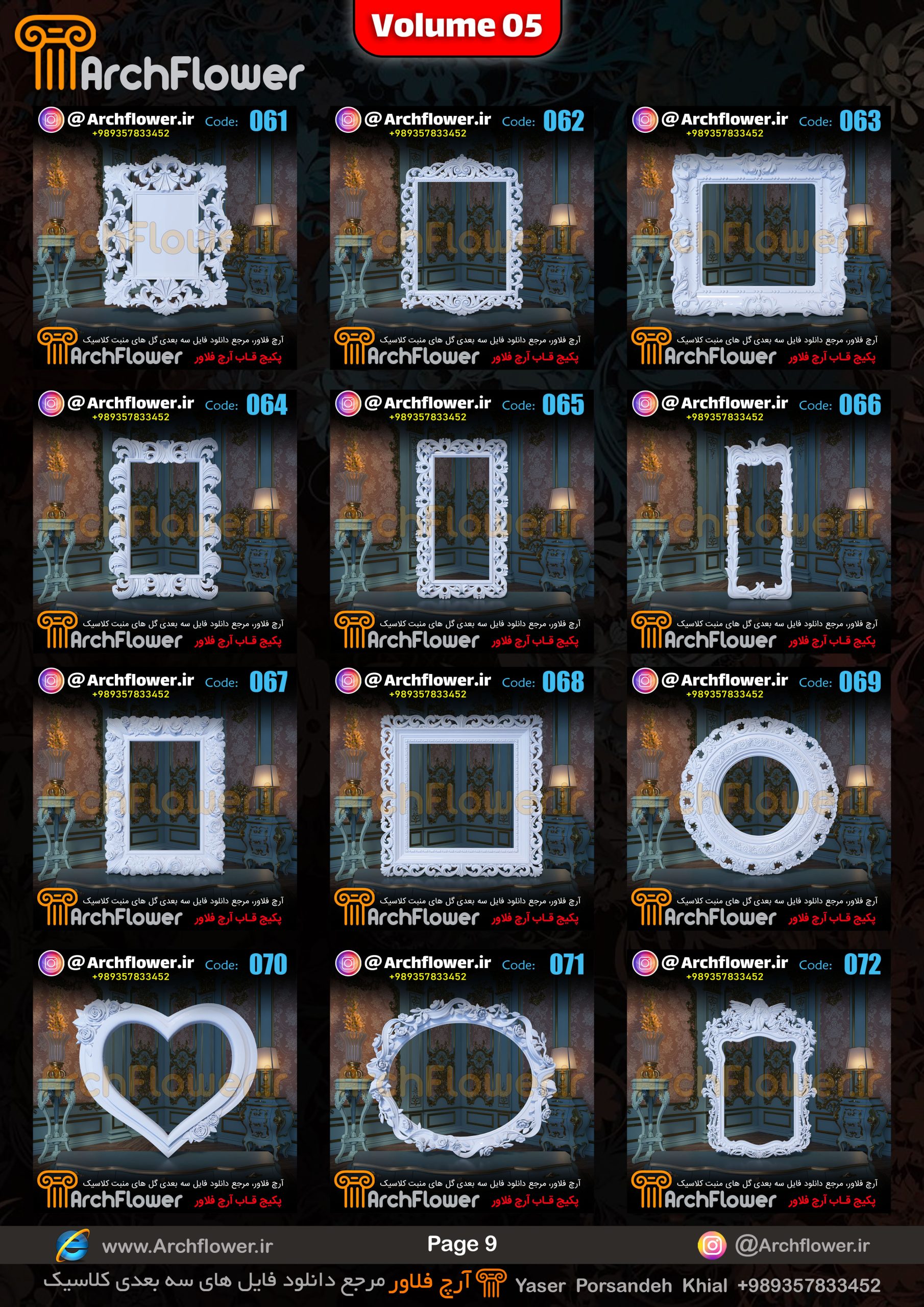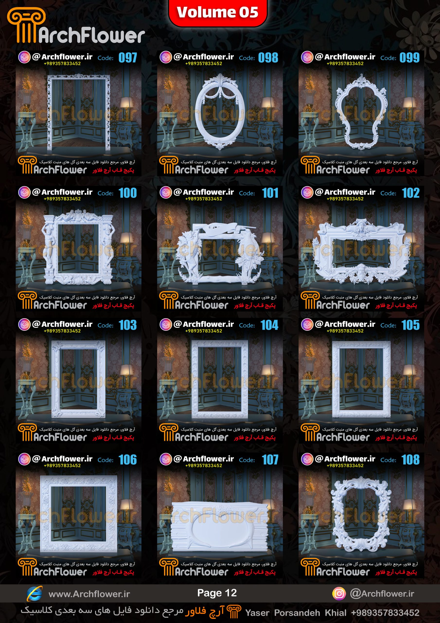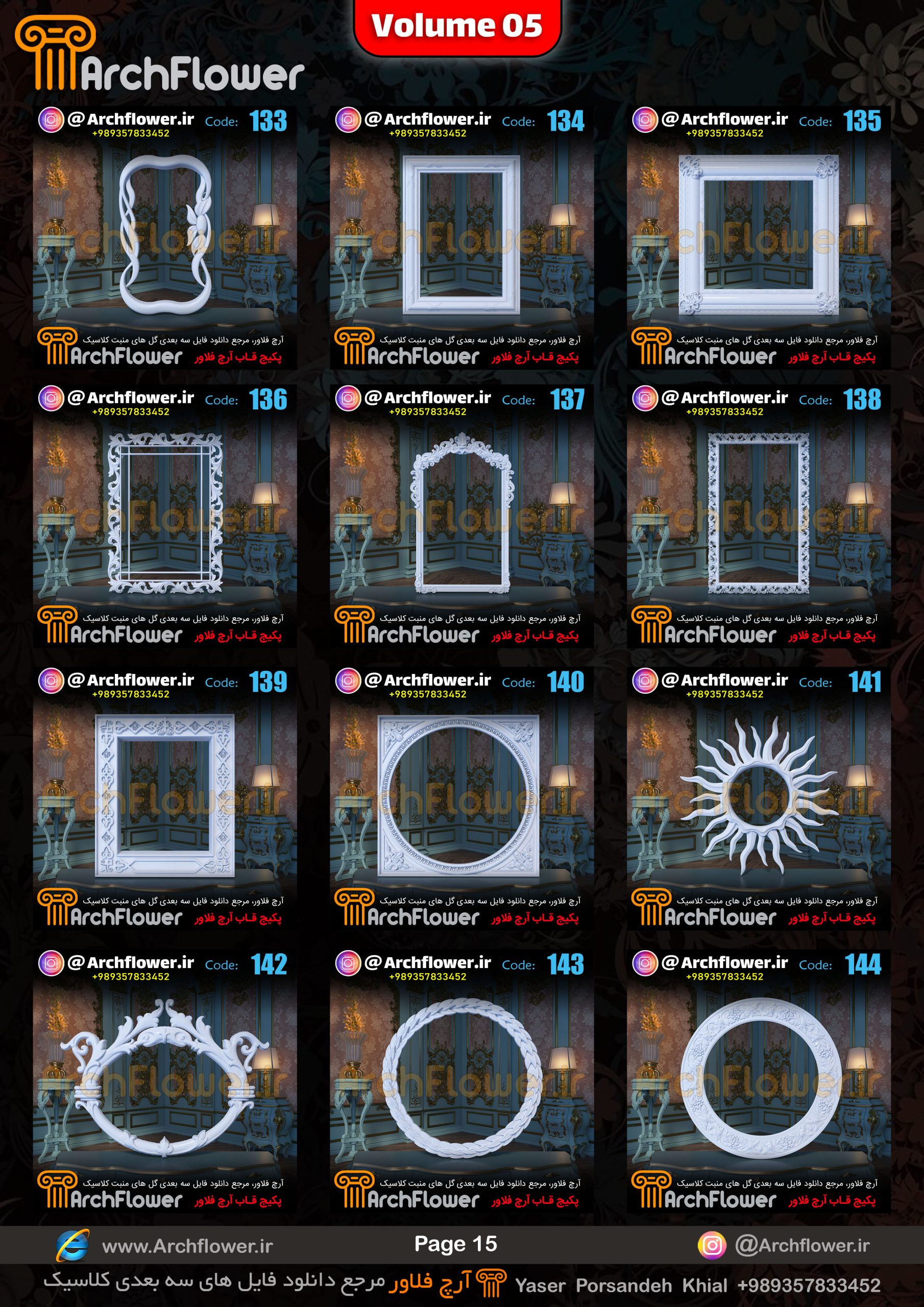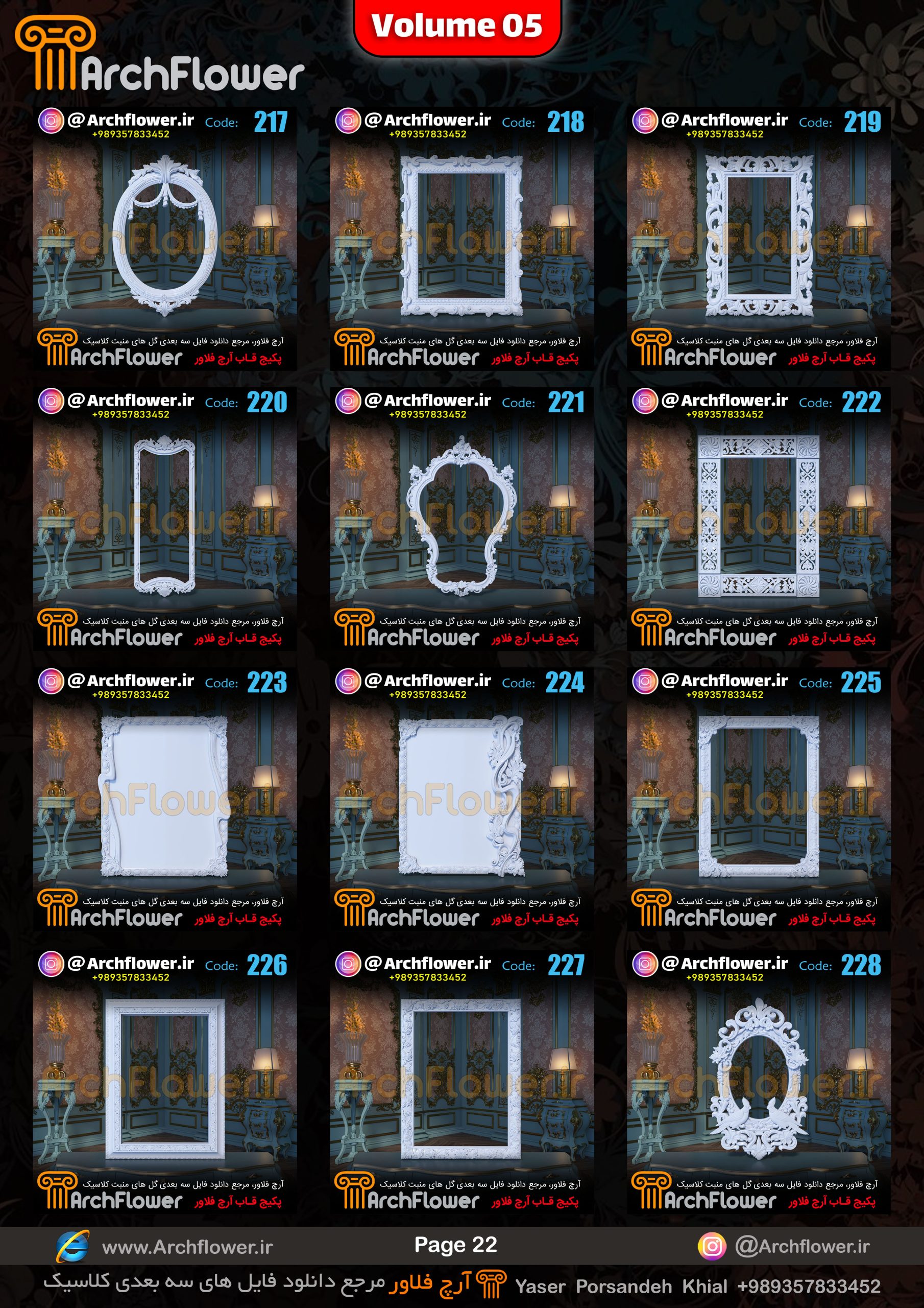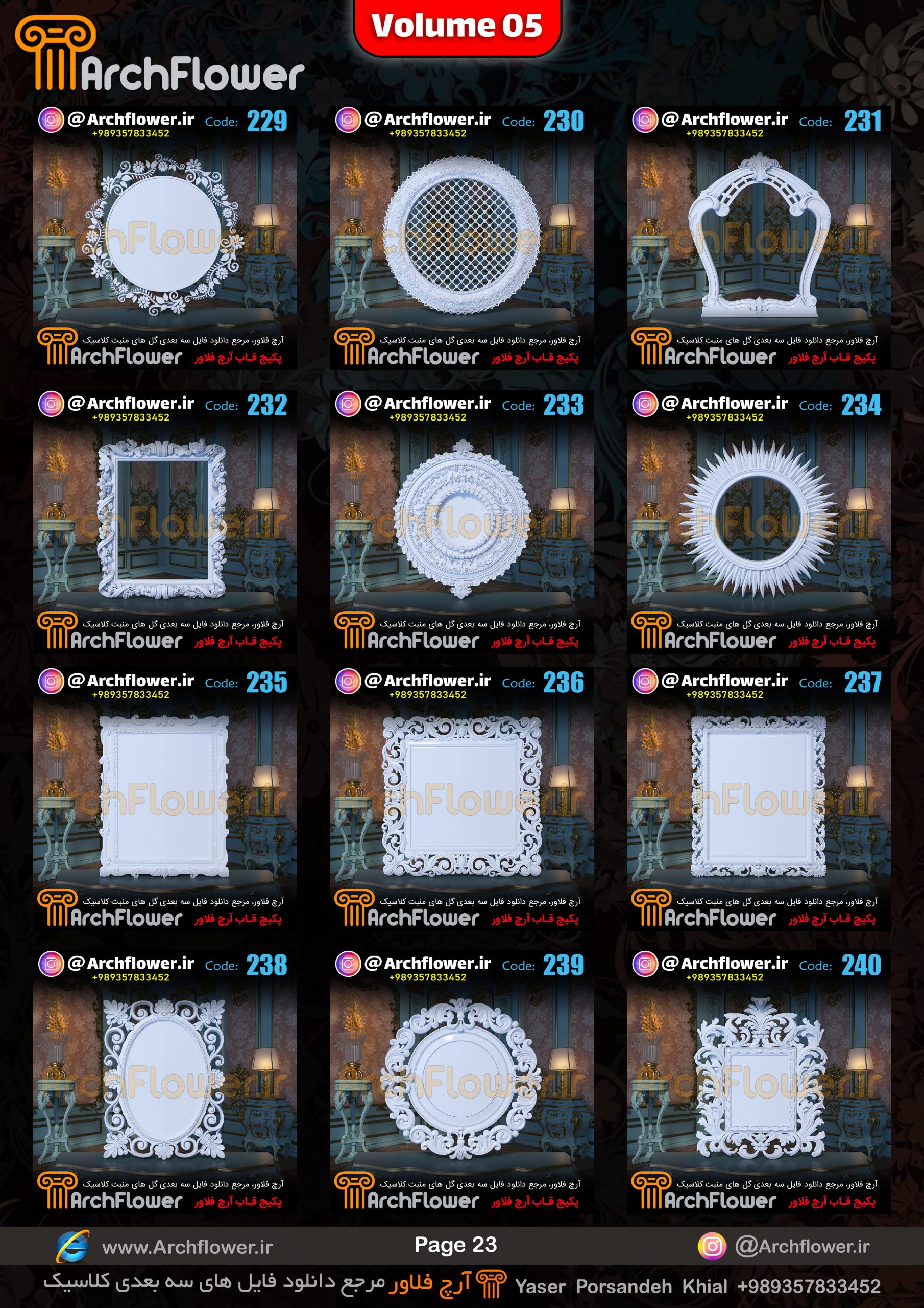 این مجموعه (قاب های کلاسیک) شامل پکیج فایل سه بعدی گل های منبت با عنوان ( فایل های سه بعدی انواع قاب های کلاسیک : Archflower_Vol.05) میباشد.علاقمندان به طراحی پروژه های کلاسیک میتونن آبجکت های این مجموعه رو تهیه کنند.و در پروژه های کلاسیک خودشون استفاده کنن.