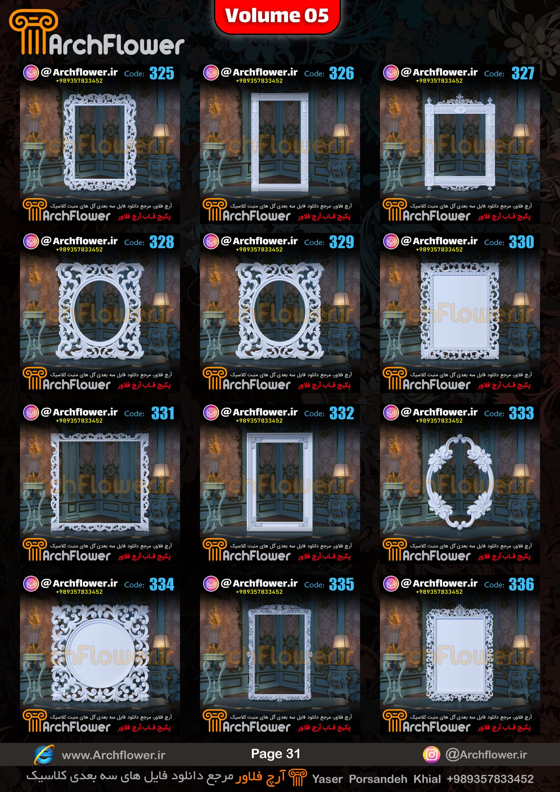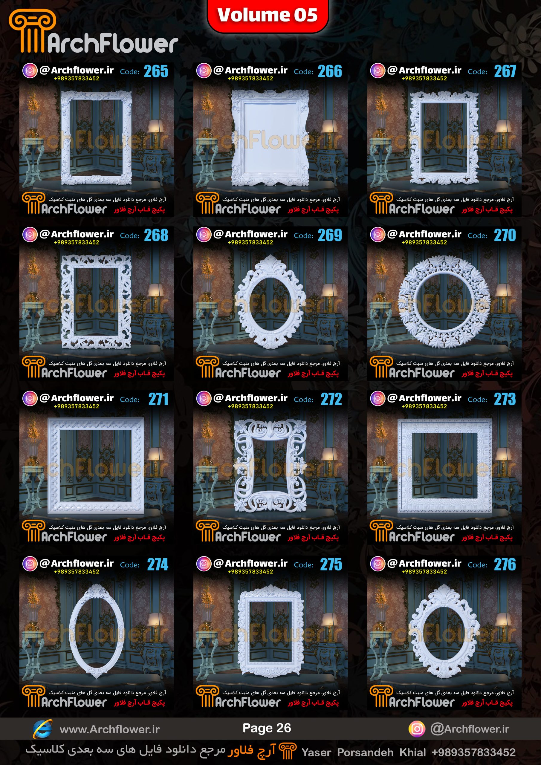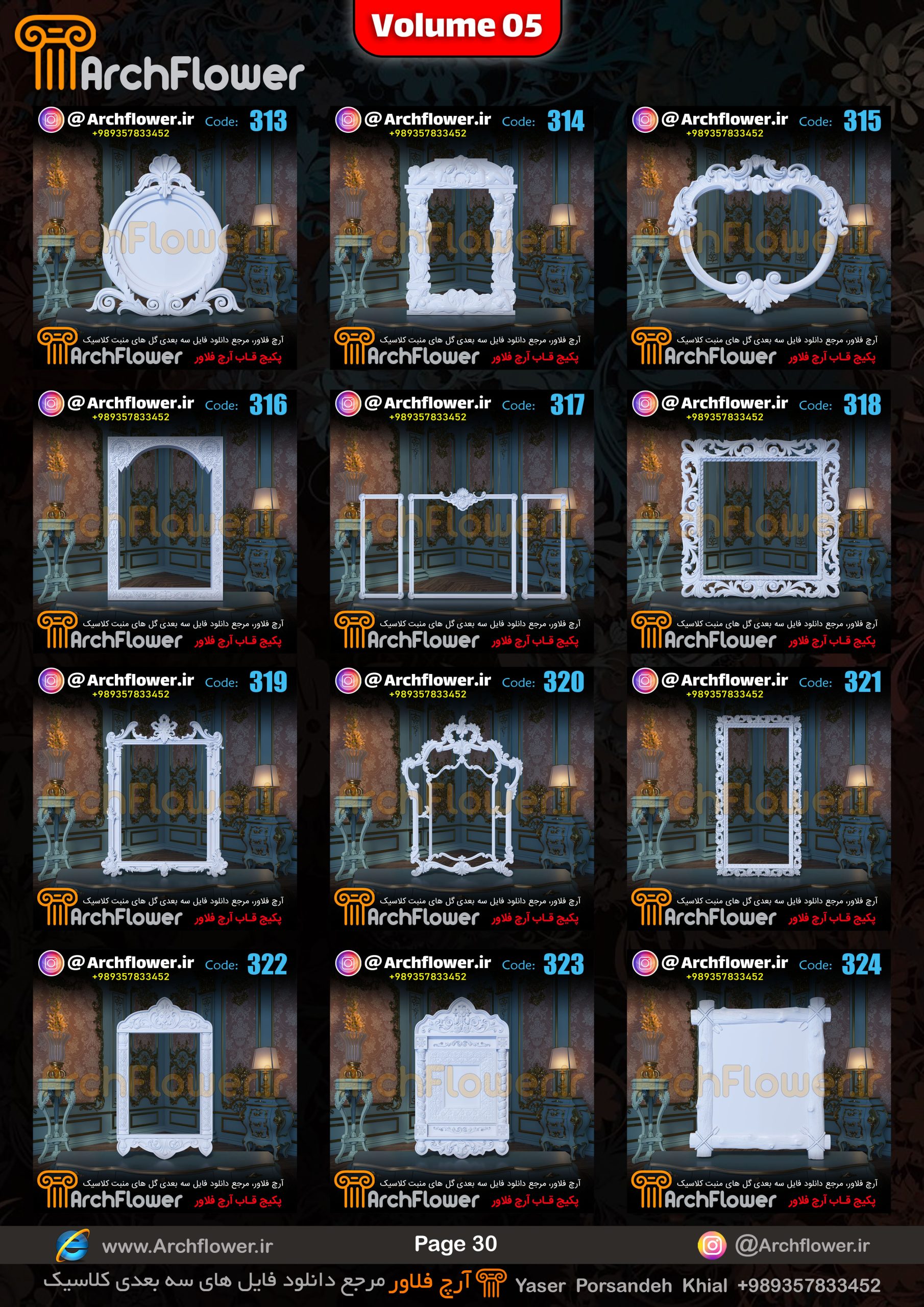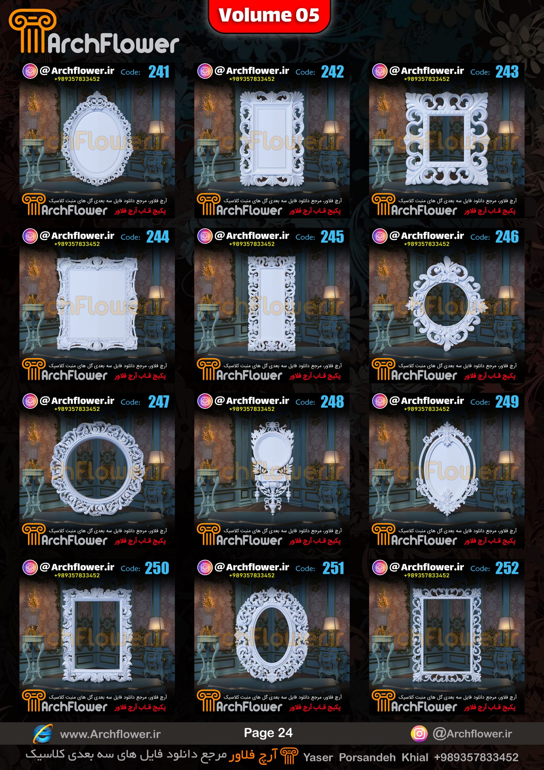 این مجموعه (قاب های کلاسیک) شامل پکیج فایل سه بعدی گل های منبت با عنوان ( فایل های سه بعدی انواع قاب های کلاسیک : Archflower_Vol.05) میباشد.علاقمندان به طراحی پروژه های کلاسیک میتونن آبجکت های این مجموعه رو تهیه کنند.و در پروژه های کلاسیک خودشون استفاده کنن.