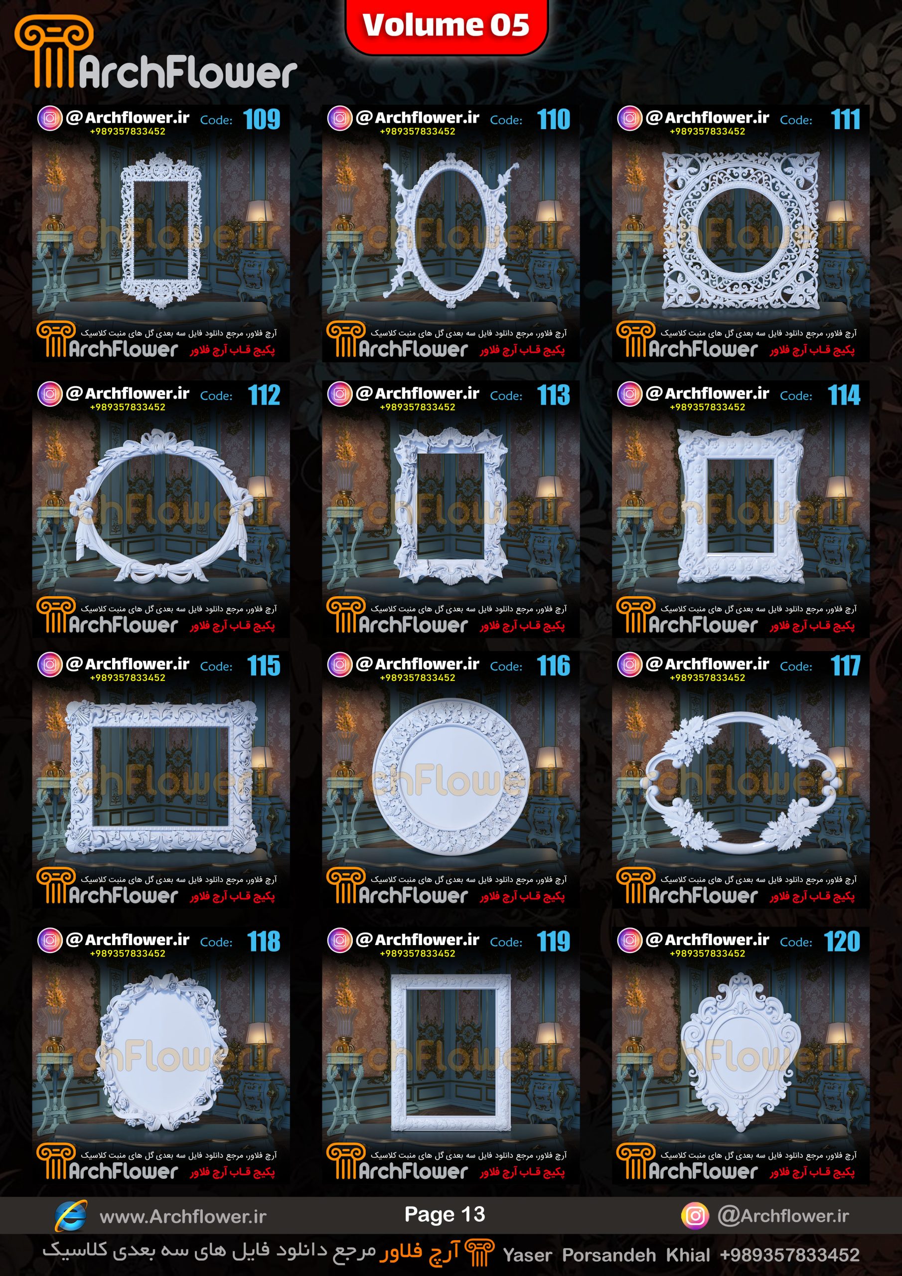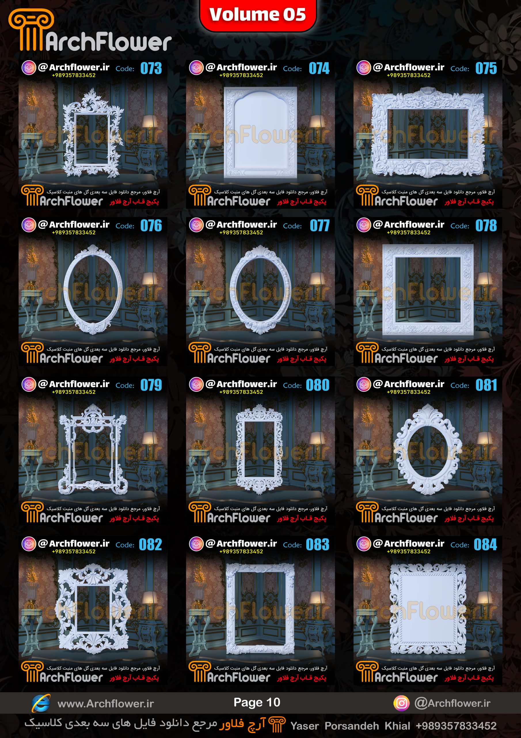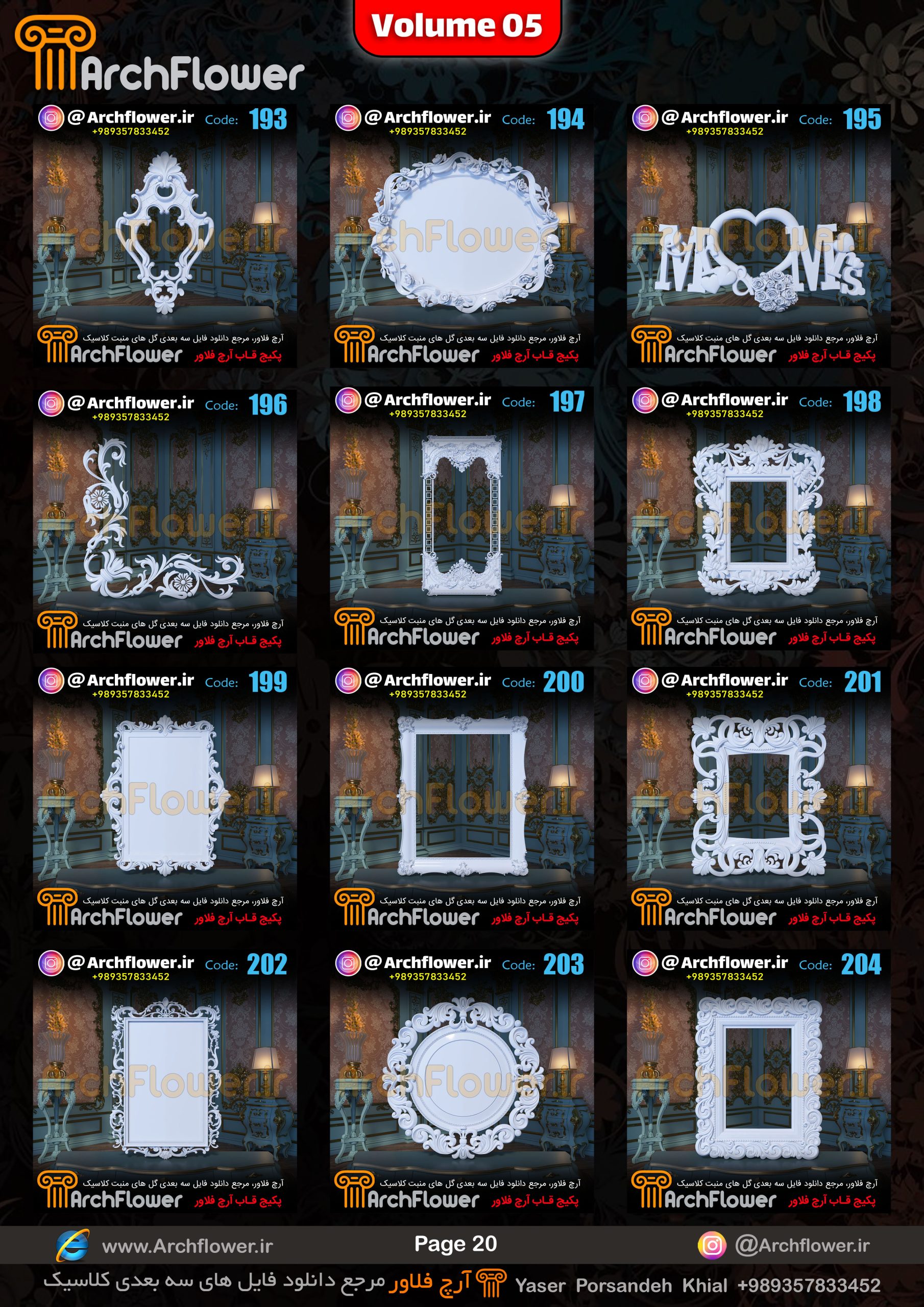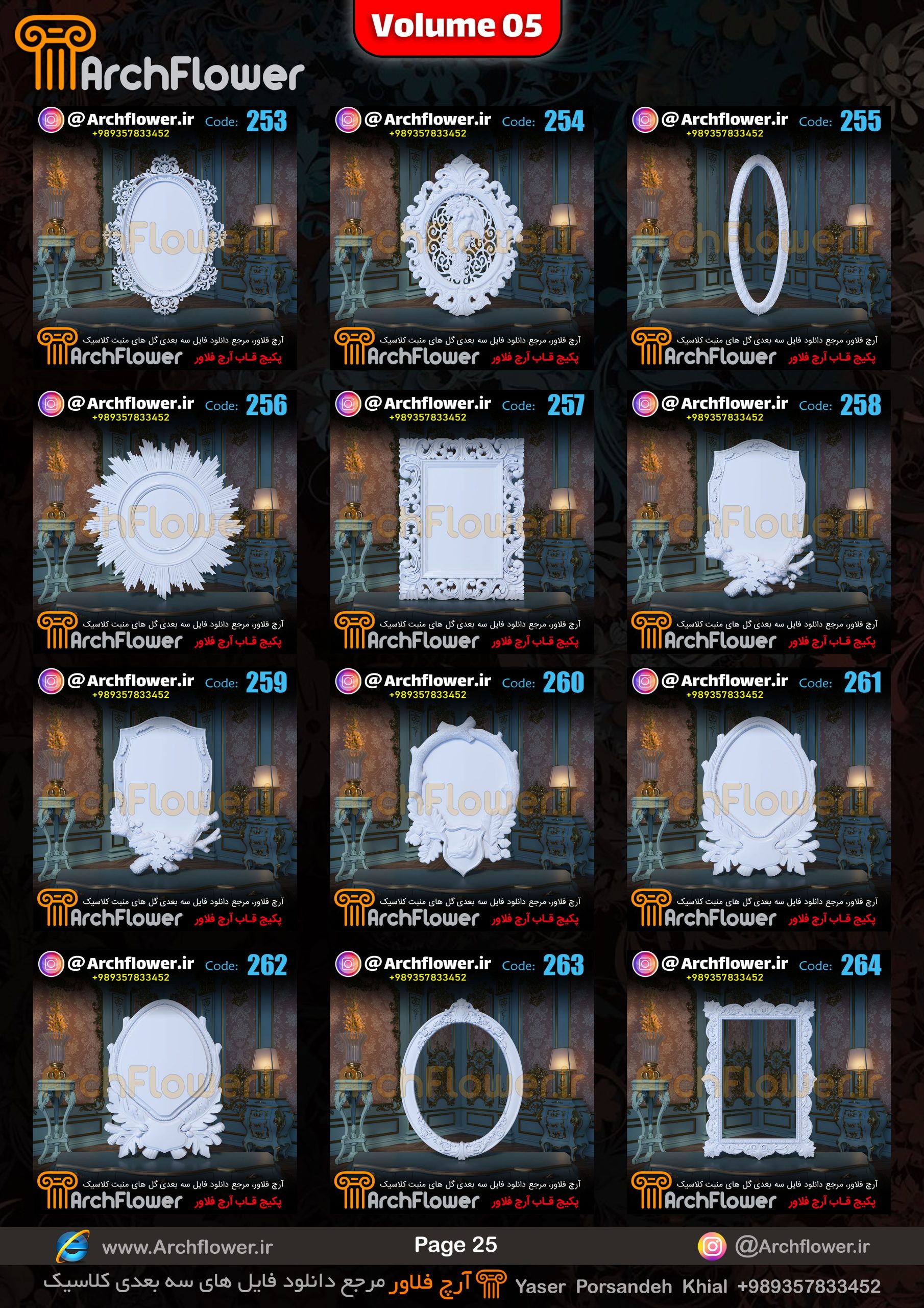 این مجموعه (قاب های کلاسیک) شامل پکیج فایل سه بعدی گل های منبت با عنوان ( فایل های سه بعدی انواع قاب های کلاسیک : Archflower_Vol.05) میباشد.علاقمندان به طراحی پروژه های کلاسیک میتونن آبجکت های این مجموعه رو تهیه کنند.و در پروژه های کلاسیک خودشون استفاده کنن.